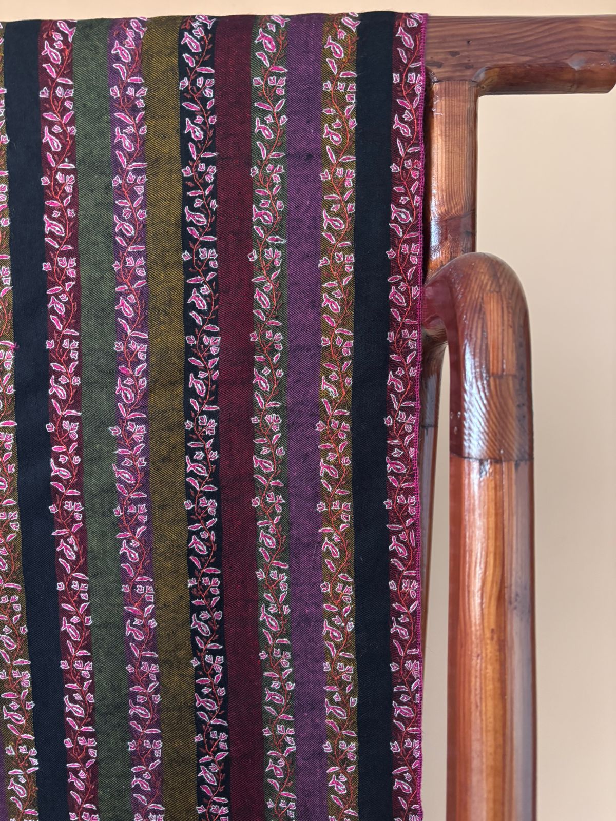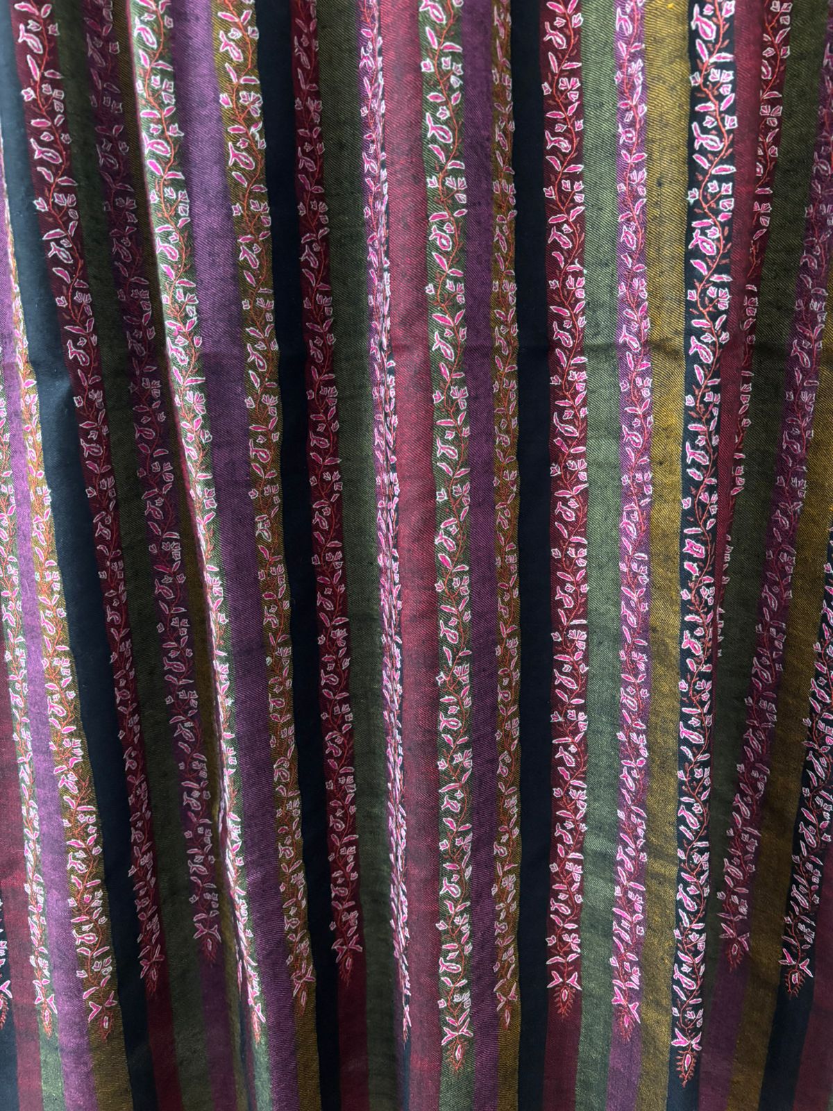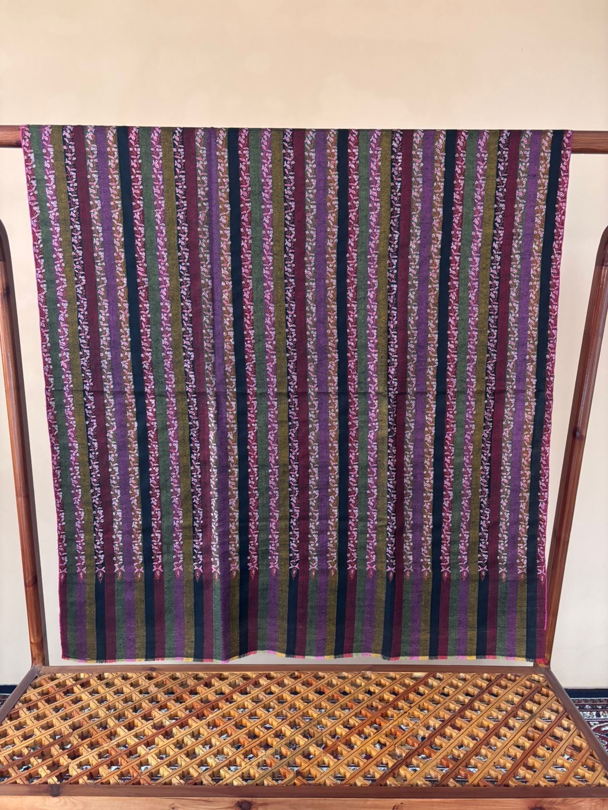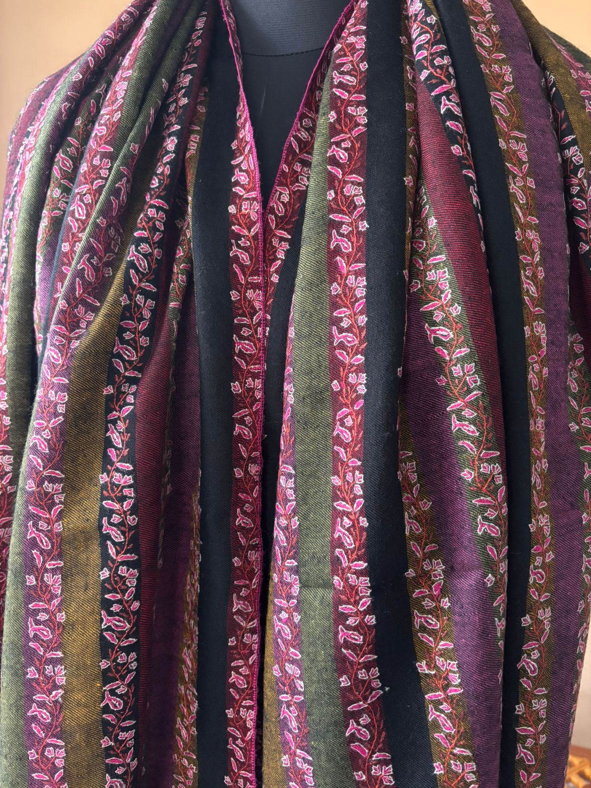This hand-embroidered pashmina is made in Kashmir which is handloom and hand-embroidered. The color combination on each piece is different due to the artisans creativity, almost no exact duplication is available. The stunning skills of these magical artists result in the lavishing embroidered pashmina shawls. This luxurious, glamorous piece is the true heritage of century-old artisan workmanship. A true borderless, elegant fashion accessory. A perfect choice for bridesmaids and wedding gifts too.